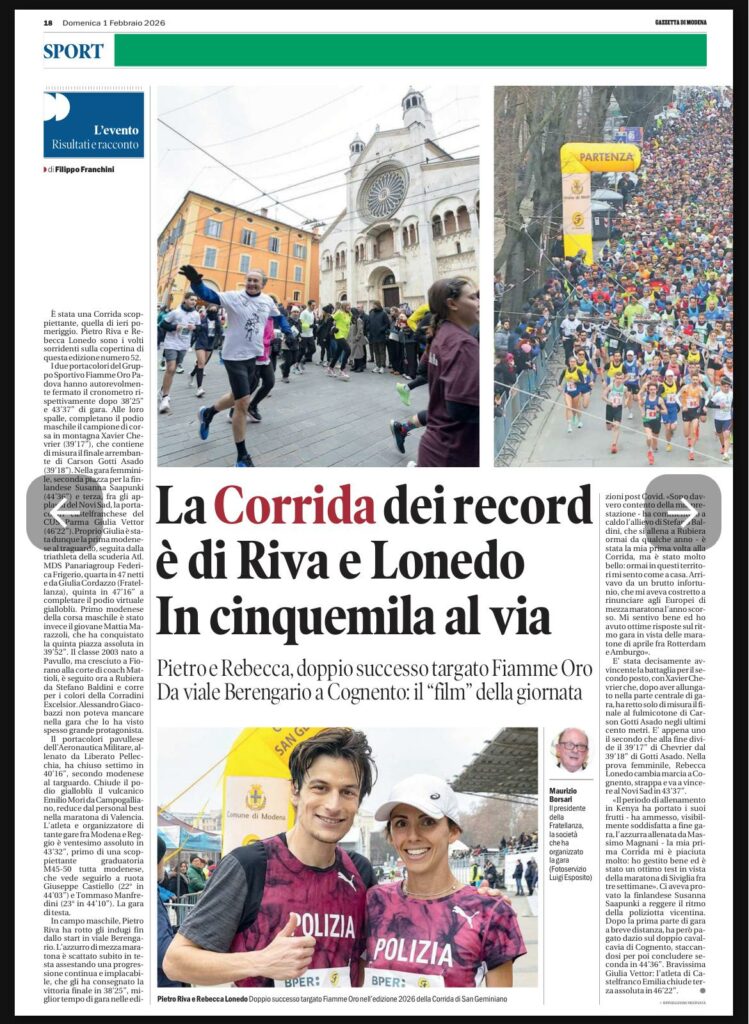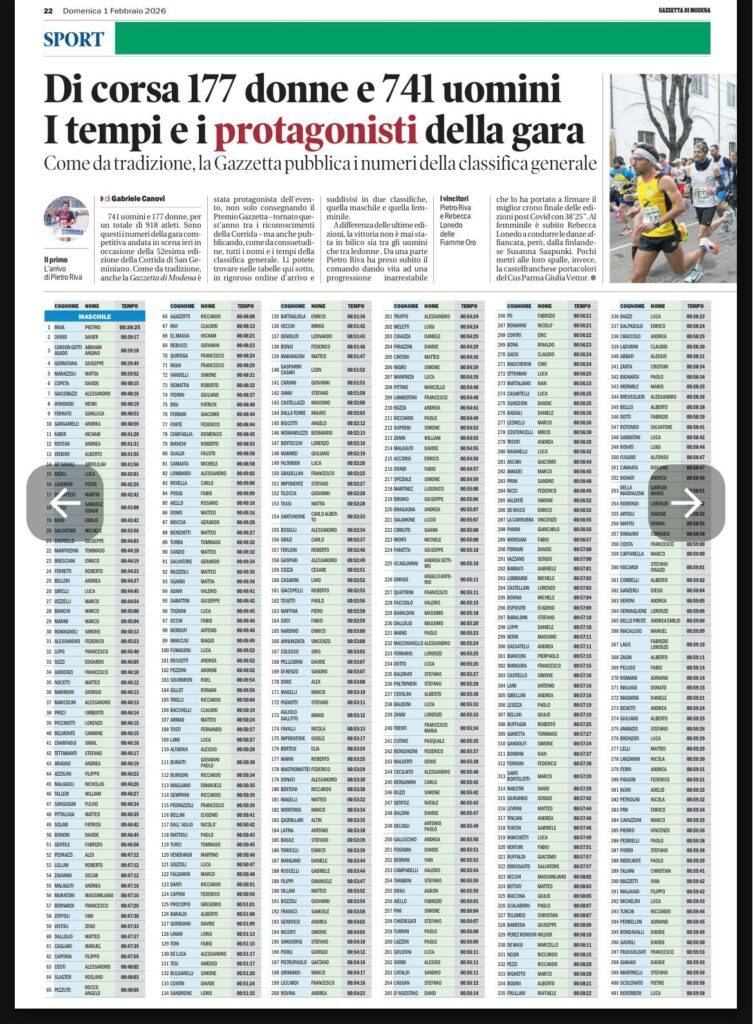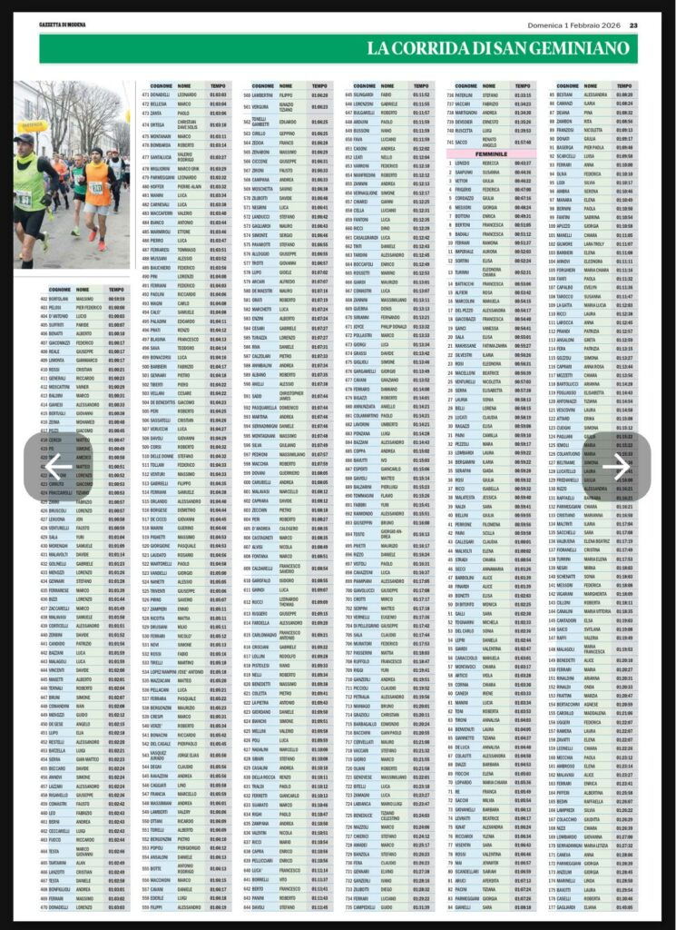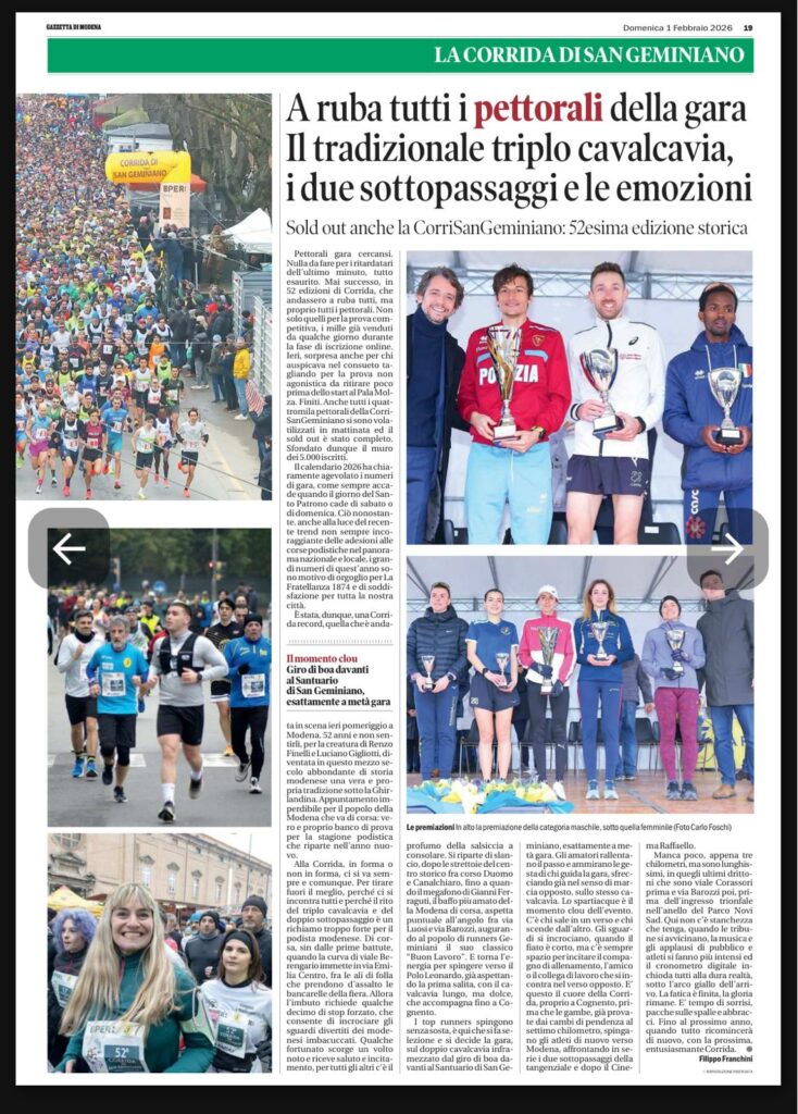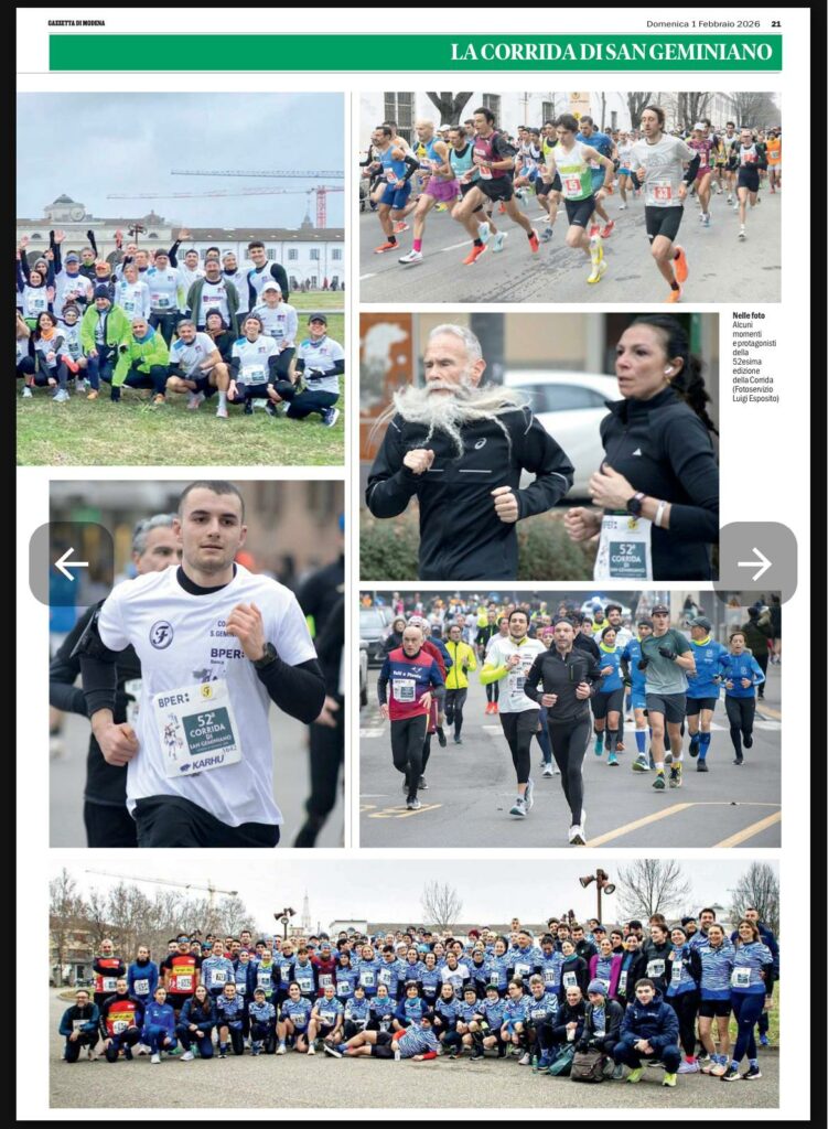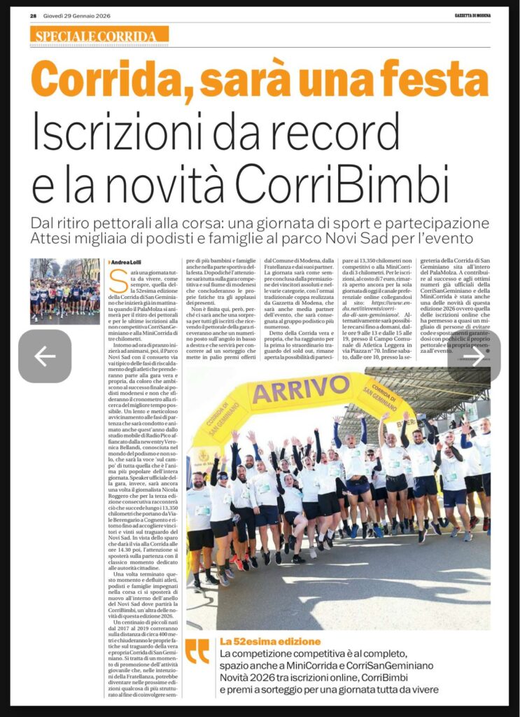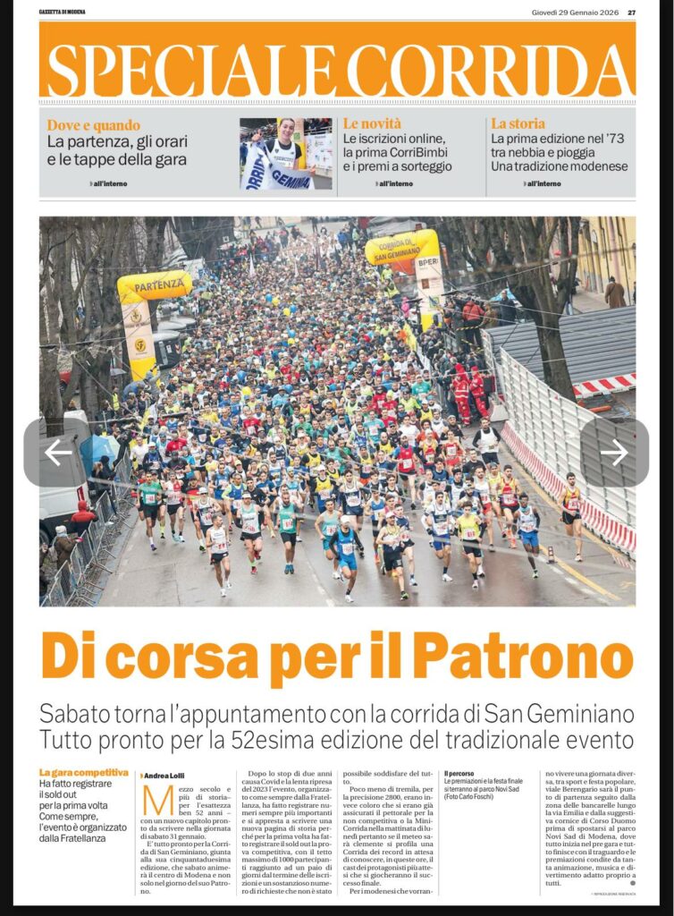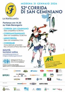 L’edizione 2026, come detto, sarà la 52esima Corrida di San Geminiano che riproporrà ancora una volta tutte le peculiarità che ne hanno fatto la storia. La prova competitiva vedrà gli atleti iscritti affrontare i consueti 13,350 chilometri che li porteranno fino a Cognento, per poi fare ritorno in città alle porte del centro storico con l’arrivo nella classica cornice del Novi Sad. Confermatissimi, ovviamente, anche gli eventi non competitivi come la Corrisangeminiano, sullo stesso percorso e distanza della Corrida competitiva, e la Minicorrida di 3 chilometri. L’appuntamento come sempre sarà organizzato dalla società A.S. La Fratellanza 18704 e con il patrocinio del Comune, della Provincia di Modena, della Regione Emilia Romagna, del Coni ed il sostegno di BPER: Banca.