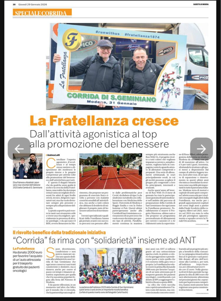 Il responsabile territoriale Retail Modena Nord Bper, Gianluigi Cozza: “BPER Banca è da sempre vicina al territorio e alle sue persone. E la Corrida è molto più di una gara podistica: è un momento in cui Modena si ritrova, si riconosce e si racconta attraverso i valori che da sempre ci uniscono — sport, comunità, inclusione e solidarietà. Quest’anno la Fratellanza 1874 ha scelto di fare un passo ulteriore, trasformando la Corrida in un evento ancora più solidale. La collaborazione con ANT Modena permette infatti di sostenere l’acquisto di un mezzo dedicato al trasporto gratuito dei pazienti oncologici, un servizio essenziale che offre supporto concreto alle persone e alle famiglie che affrontano un percorso di cura complesso e delicato. Come BPER, condividiamo pienamente lo spirito di questa iniziativa. Crediamo che una banca del territorio debba saper correre – metaforicamente e non – accanto alle persone, sostenendo progetti che migliorano la qualità della vita della comunità, che generano valore sociale e che promuovono la cultura della prevenzione, del benessere e dello sport”.