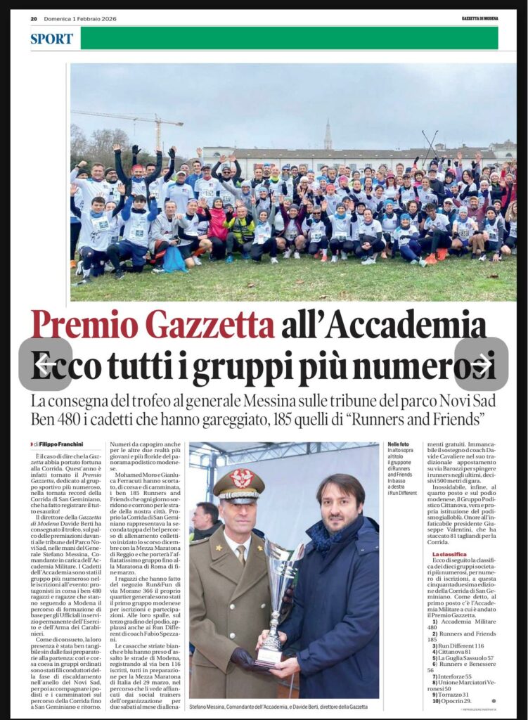 Per la prima volta nella sua storia la gara competitiva farà registrare il sold out, con gli ultimi pettorali a disposizione per raggiungere il numero massimo di 1000 che saranno assegnati nelle prossime ore. In attesa di conoscere i nomi degli atleti più accreditati che animeranno la corsa, però, i primi riscontri parlano di un innalzamento del livello medio dei partecipanti a conferma dell’attesa con cui in tanti aspettano questo appuntamento unico nel suo genere. Anche la prova non competitiva, inoltre, si preannuncia il solito successo con il solito mare di modenesi che si riverseranno sul percorso. Il dato parziale alla mattinata di oggi, infatti, parla di 2800 presenze già confermate con la novità delle iscrizioni online che ha fatto registrare un grande successo. Le ultime giornate e la stessa mattinata del 31 contribuiranno, come sempre, in maniera significativa a far lievitare questi numeri in cui spicca già la solita nutrita partecipazione dell’Accademia Militare con ben 480 Cadetti pronti ad onorare l’appuntamento.