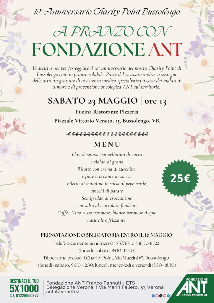 Unโoccasione per stare insieme e sostenere concretamente il lavoro di ANT: tutto il ricavato sarร destinato ai progetti di cure mediche domiciliari specialistiche gratuite per i pazienti oncologici e alle attivitร di prevenzione oncologica sul territorio.
