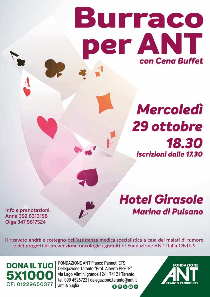 Una nuova occasione per unire divertimento e solidarietà: mercoledì 29 ottobre torna l’appuntamento con il Burraco per ANT, accompagnato da una deliziosa cena buffet.