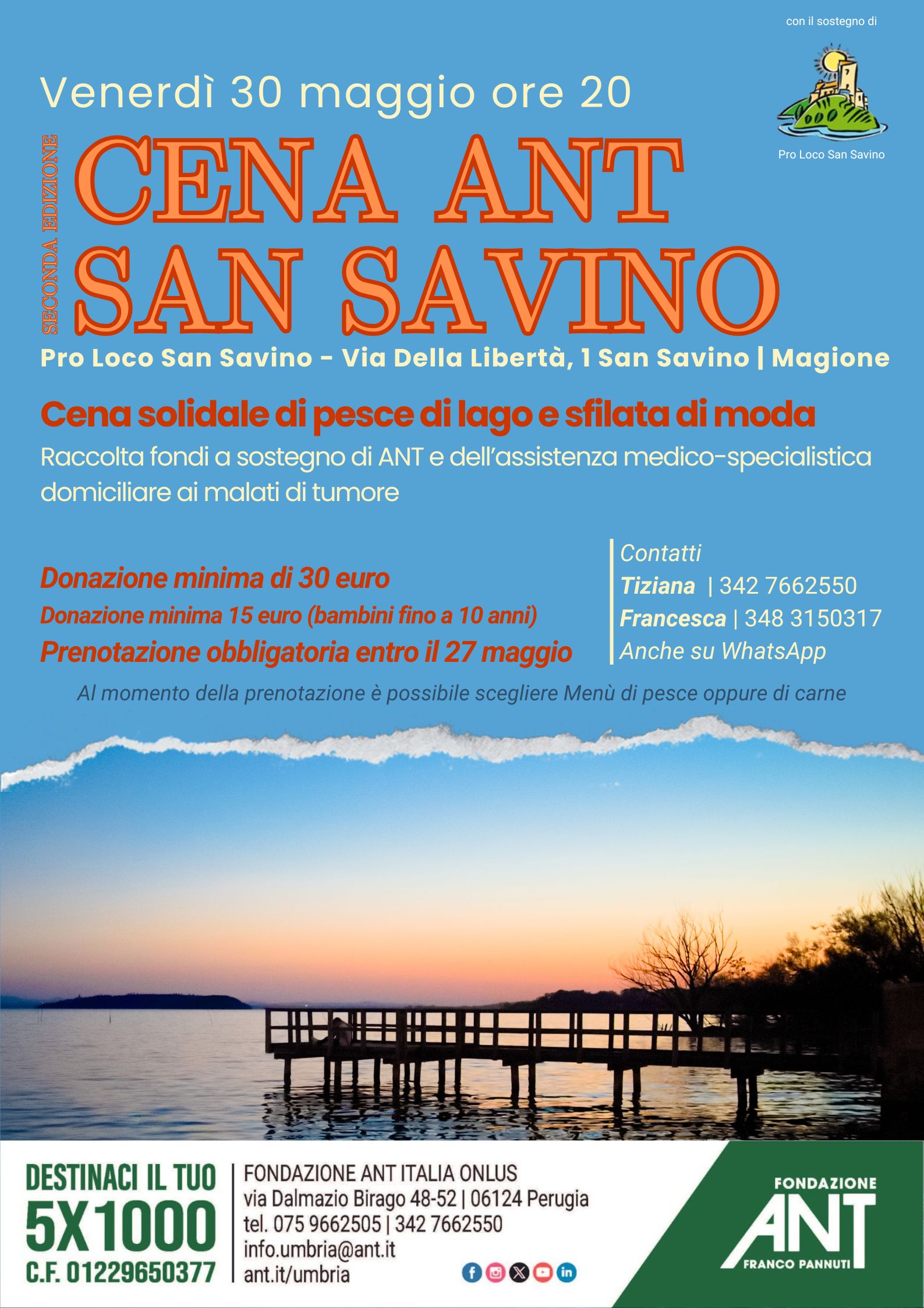 Venerdì 30 maggio, alle ore 20, presso la Pro Loco di San Savino si terrà la cena di raccolta fondi a base di pesce di lago a sostegno di ANT e dell’assistenza medico specialistica domiciliare ai malati di tumore del nostro territorio.