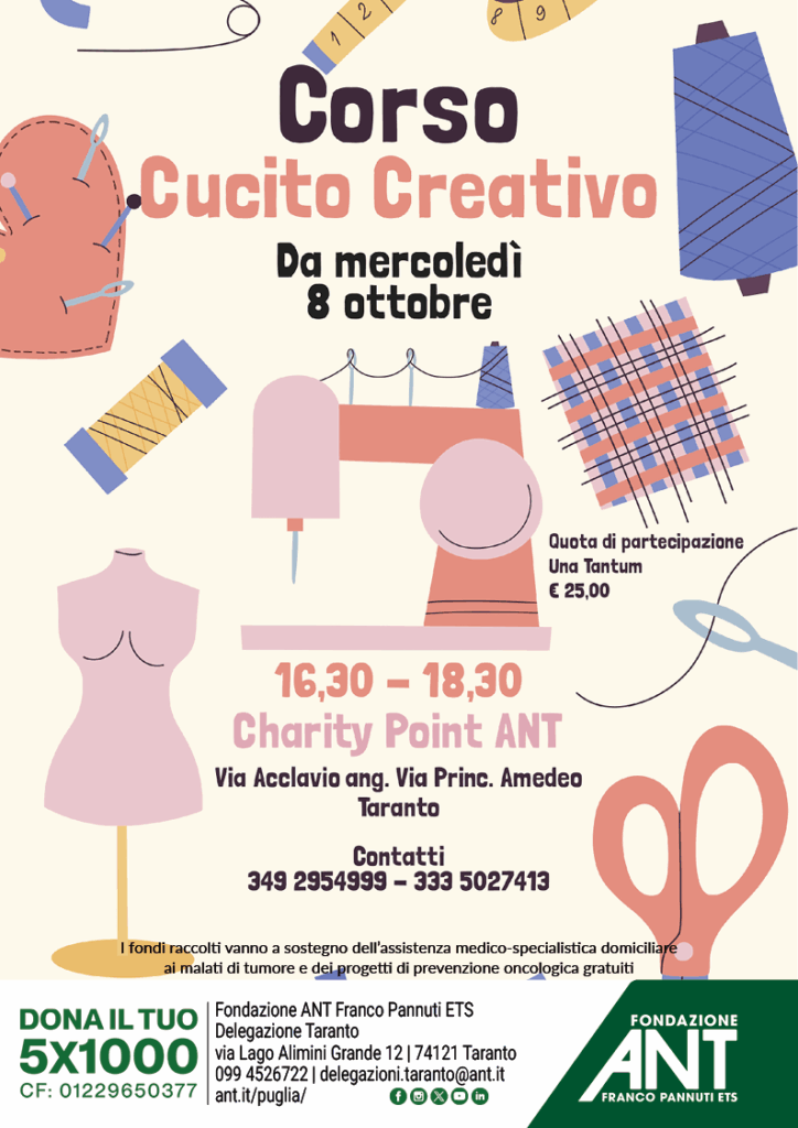 L’ANT di Taranto organizza un nuovo e interessante appuntamento: il Corso di Cucito Creativo, che prenderà il via mercoledì 8 ottobre presso il Charity Point ANT, in via Acclavio angolo via Principe Amedeo, a Taranto.