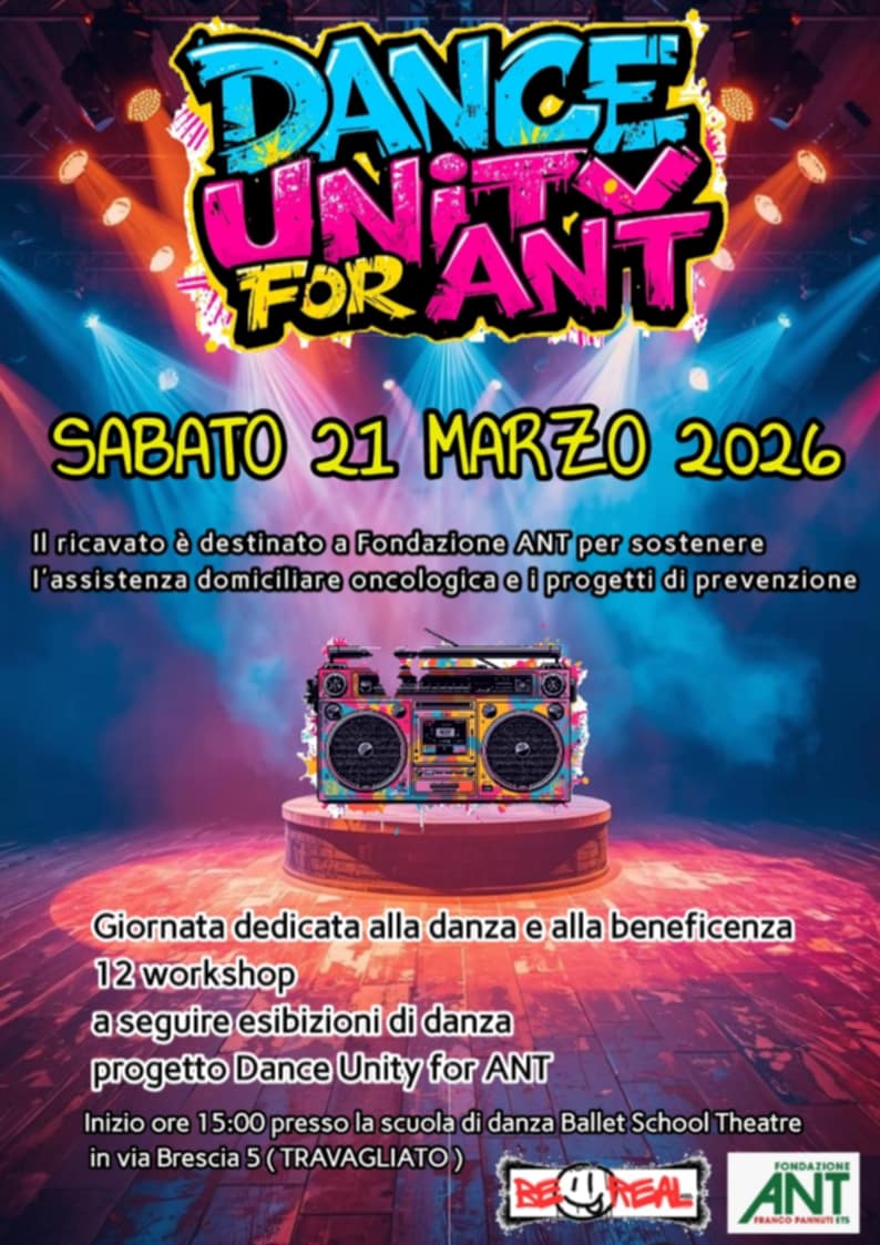 Sabato 21 marzo 2026, presso la scuola di danza Ballet School Theatre di Travagliato (via Brescia 5), si terrà “Dance Unity for ANT”, una giornata interamente dedicata alla danza e alla beneficenza.
