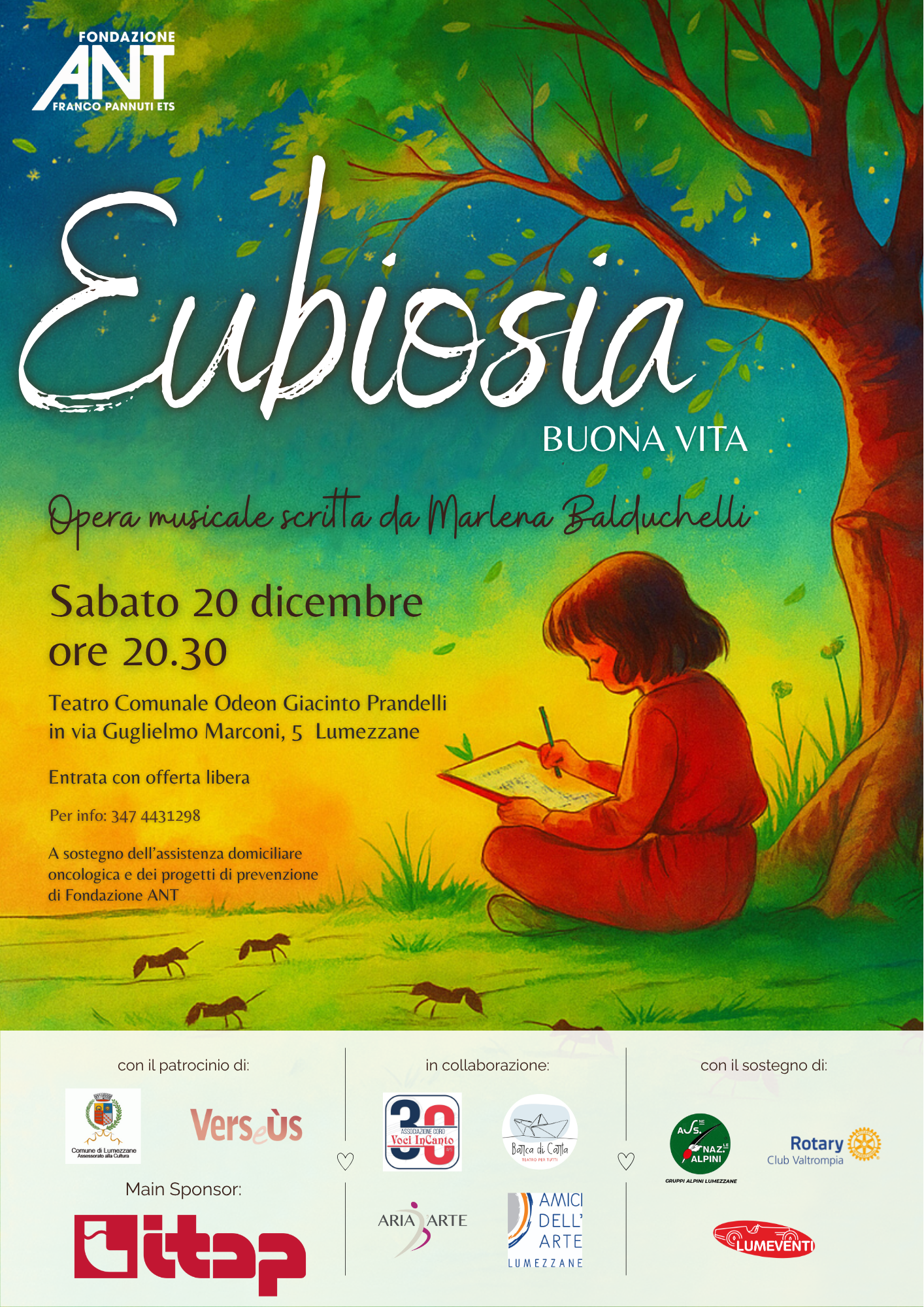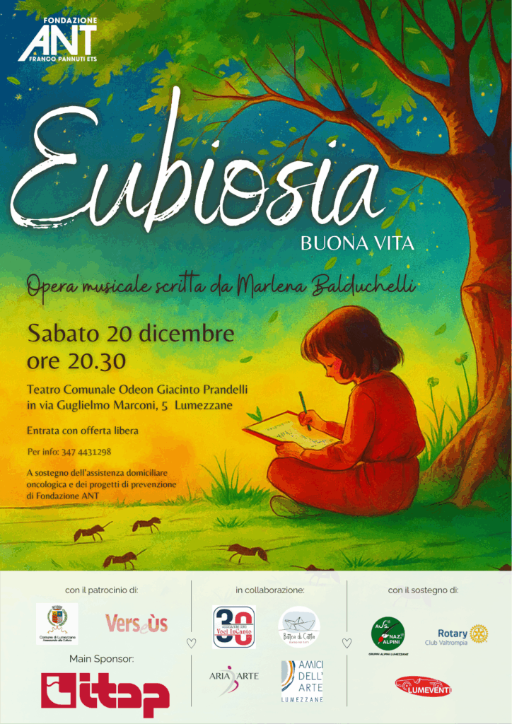 Fondazione ANT invita la cittadinanza a partecipare a “Eubiosia – Buona Vita”, l’opera musicale scritta da Marlena Balducchelli che andrà in scena sabato 20 dicembre alle ore 20.30 al Teatro Comunale Odeon Giacinto Prandelli di Lumezzane (via Guglielmo Marconi, 5).