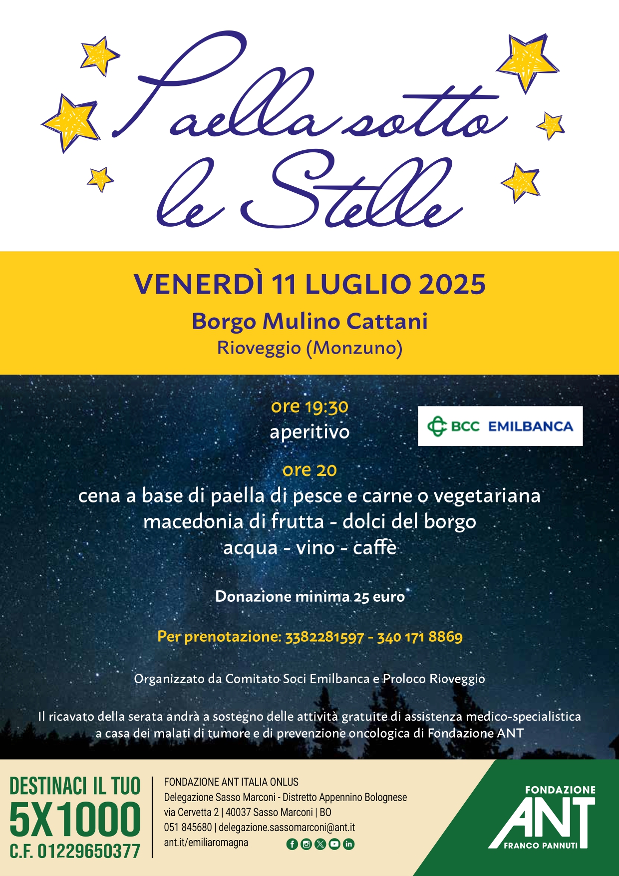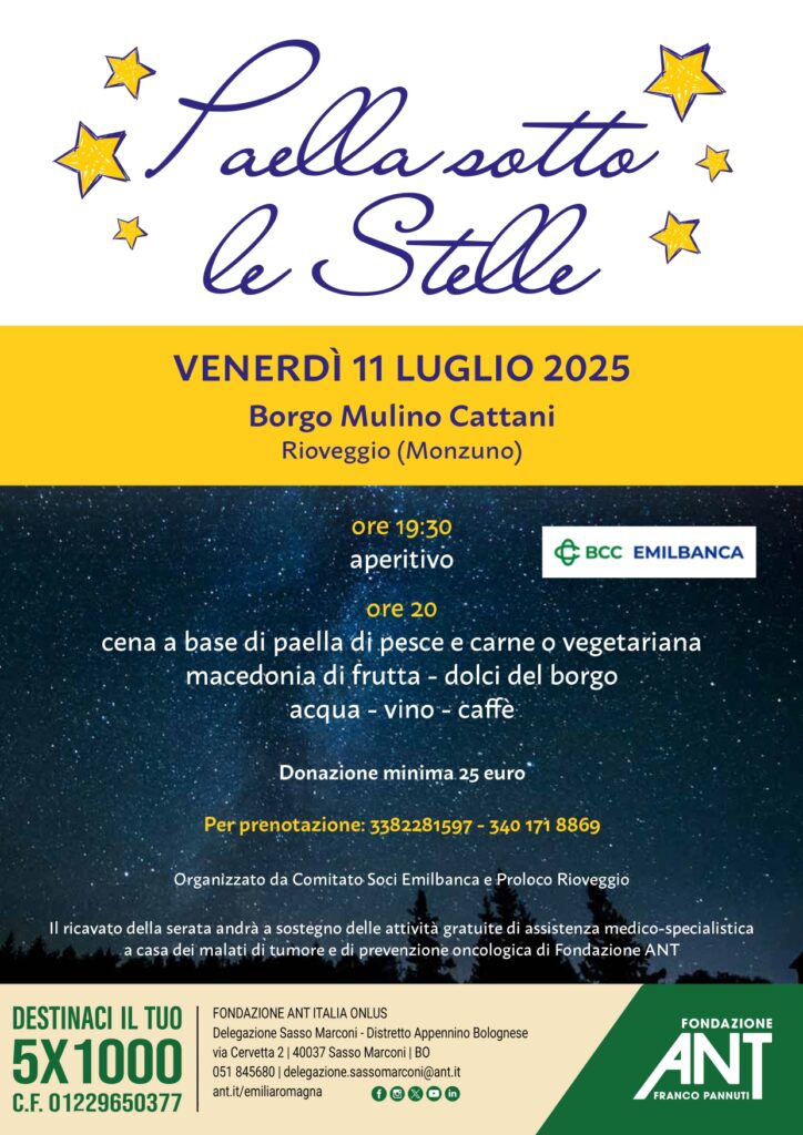 Fondazione ANT, in collaborazione con il Comitato Soci Emilbanca e la Pro Loco di Rioveggio, invita la cittadinanza a partecipare all’evento “Paella sotto le Stelle”, in programma venerdì 11 luglio 2025 presso Borgo Mulino Cattani a Rioveggio (Monzuno).