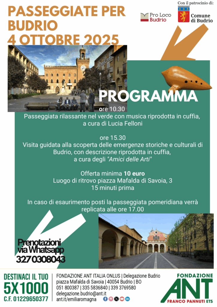 Con il patrocinio del Comune di Budrio e Pro Loco Budrio, l’evento sostiene la Fondazione ANT.