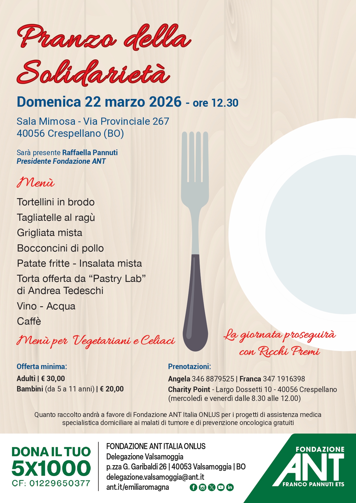 Le volontarie ANT di Crespellano vi invitano al Pranzo della Solidarietà, appuntamento domenica 22 marzo alle ore 12.30 presso la Sala Mimosa – Crespellano.