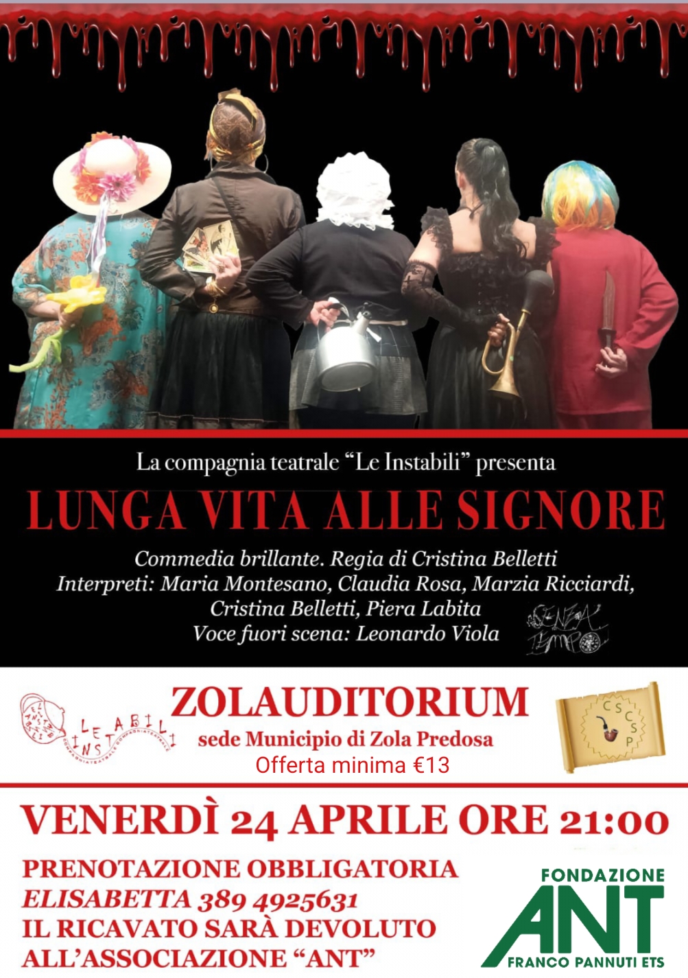 Fondazione ANT ed i Volontari della Delegazione di Zola Predosa vi invitano ad un divertentissimo spettacolo teatrale. La compagnia “Le Instabili” presenta “Lunga Vita alle Signore”, una commedia brillante con la regia di Cristina Belletti.