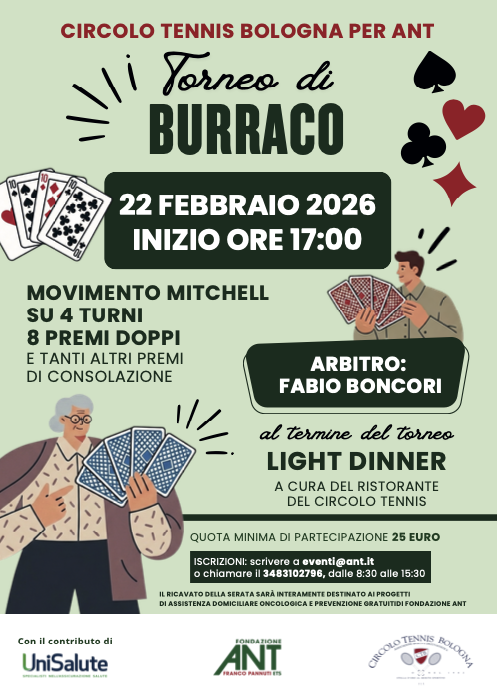 Il Circolo Tennis Bologna è lieto di invitarvi al Torneo di Burraco in favore di ANT