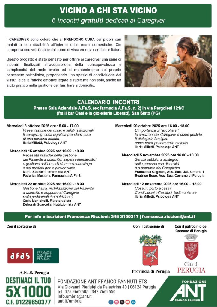 Sei incontri gratuiti, guidati da professionisti, per scoprire strumenti utili, confrontarsi con altri caregiver e non sentirsi soli in questo cammino. Il corso gode del Patrocinio della Provincia di Perugia, del Comune di Perugia e con il sostegno e della collaborazione di A.Fa.S.