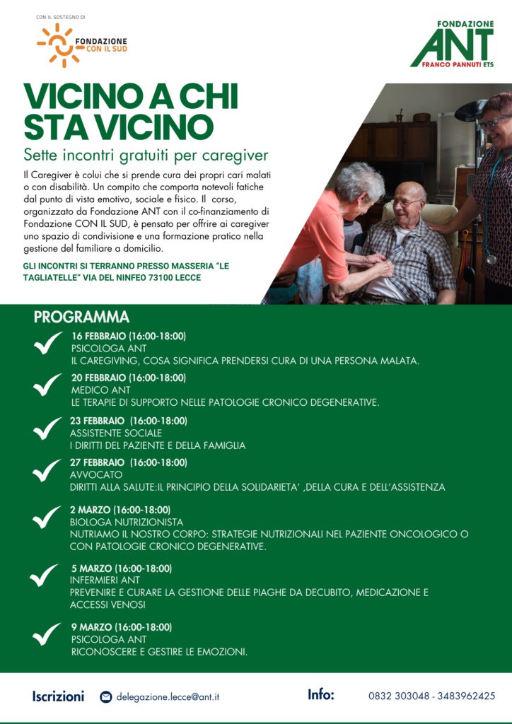 Prendersi cura di un familiare malato significa affrontare un carico emotivo, fisico e organizzativo spesso. Fondazione ANT avvia a Lecce un ciclo di sette incontri gratuiti dedicati ai caregiver, nell’ambito del progetto interregionale Lotta al tumore: dalla prevenzione al fine vita, realizzato con il co-finanziamento di Fondazione CON il Sud.