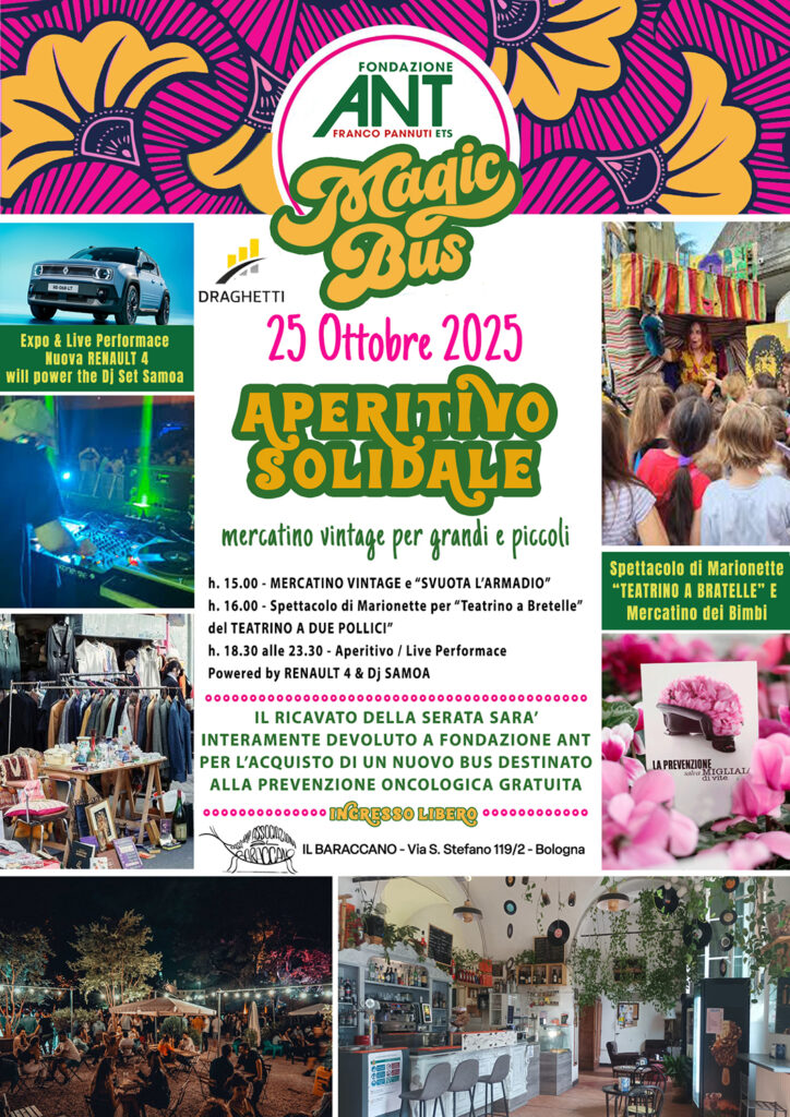 E’ in programma sabato 25 ottobre, negli spazi della Casa delle Associazioni al Baraccano in via Santo Stefano 119/2, il secondo capitolo del contenitore di eventi solidali ‘MAGIC BUS‘, ideato da Fondazione ANT la scorsa primavera per raccogliere risorse a favore dell’acquisto di un nuovo Bus della Prevenzione, che possa aggiungersi alla flotta di quattro ambulatori mobili utilizzati quotidianamente dall’Ets bolognese per i suoi programmi di controlli diagnostici oncologici gratuiti.