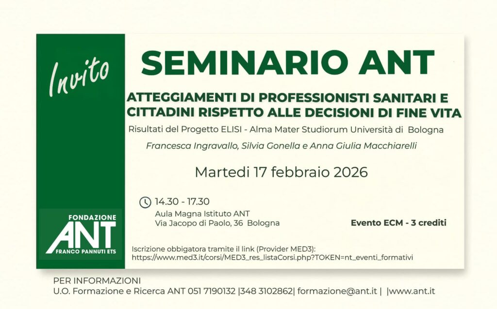 Il seminario si terrà martedì 17 febbraio 2026, presso l’Aula Magna dell’Istituto ANT a Bologna, ed è accreditato ECM (3 crediti).