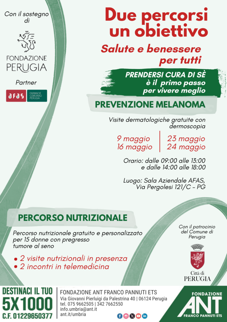 Da un lato, verranno realizzate 4 giornate di controlli diagnostici gratuiti per la prevenzione del melanoma e di altre neoplasie della cute, articolate su un totale di 96 visite preventive eseguite da un medico specialista in dermatologia incaricato da Fondazione ANT, realtà di riferimento del Terzo Settore italiano nei campi dell’assistenza domiciliare gratuita alle persone malate di tumore e, appunto, della prevenzione oncologica. Ogni giornata di progetto melanoma sarà articolata in 24 visite, erogate previo appuntamento nelle fasce orarie dalle 9 alle 13 e dalle 14 alle 18 e ospitate nei locali della Sala Aziendale AFAS di Via Pergolesi 121/C, a Perugia.