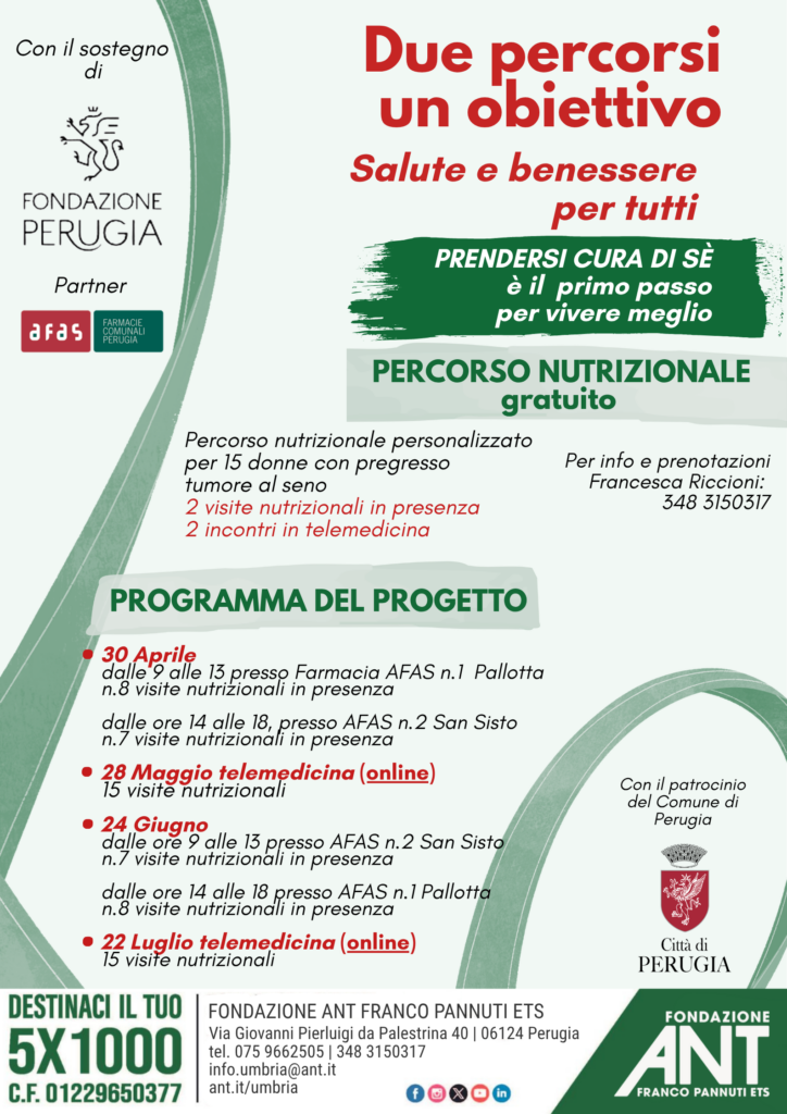 Dall’altro lato, sarà messo in campo un percorso nutrizionale personalizzato per donne con pregresso tumore al seno, altrettanto gratuito, che vedrà 15 pazienti frequentare quattro appuntamenti (due in presenza e due da remoto) volti a promuovere il miglioramento dello stile di vita e delle abitudini alimentari. Nel dettaglio, il percorso sarà realizzato con una nutrizionista ANT e centrato sul ruolo determinante della nutrizione e di un corretto stile di vita nella prevenzione terziaria del carcinoma mammario, con un approccio ‘taylor made’ che, sul territorio umbro, risulta particolarmente raro e innovativo.