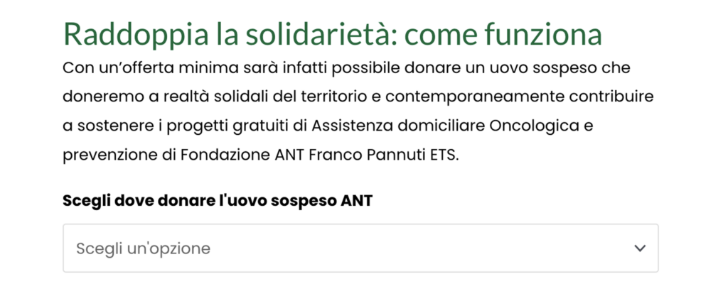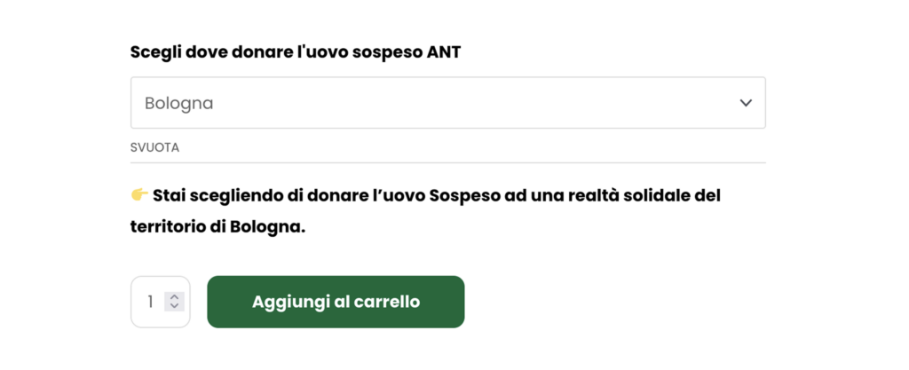 🔍 Su scegli un’opzione nella scheda prodotto dal menù a tendina potrai verificare le zone che aderiscono all’iniziativa e scegliere dove donare il panettone sospeso.
